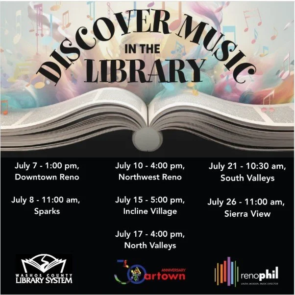 Alex Notes ♪♪: “Discover Music is an educational outreach program where Reno Philharmonic musicians travel to Northern Nevada schools and libraries to perform assemblies tailored to the ages and specifications of each audience. These are designed to give students and families a close-up look at symphonic music through performances, demos, and fun participatory activities. Groups include Discover Brass, Discover Strings, Discover Tango, and Discover Winds comprised each of 2-5 musicians from the Reno Phil.”