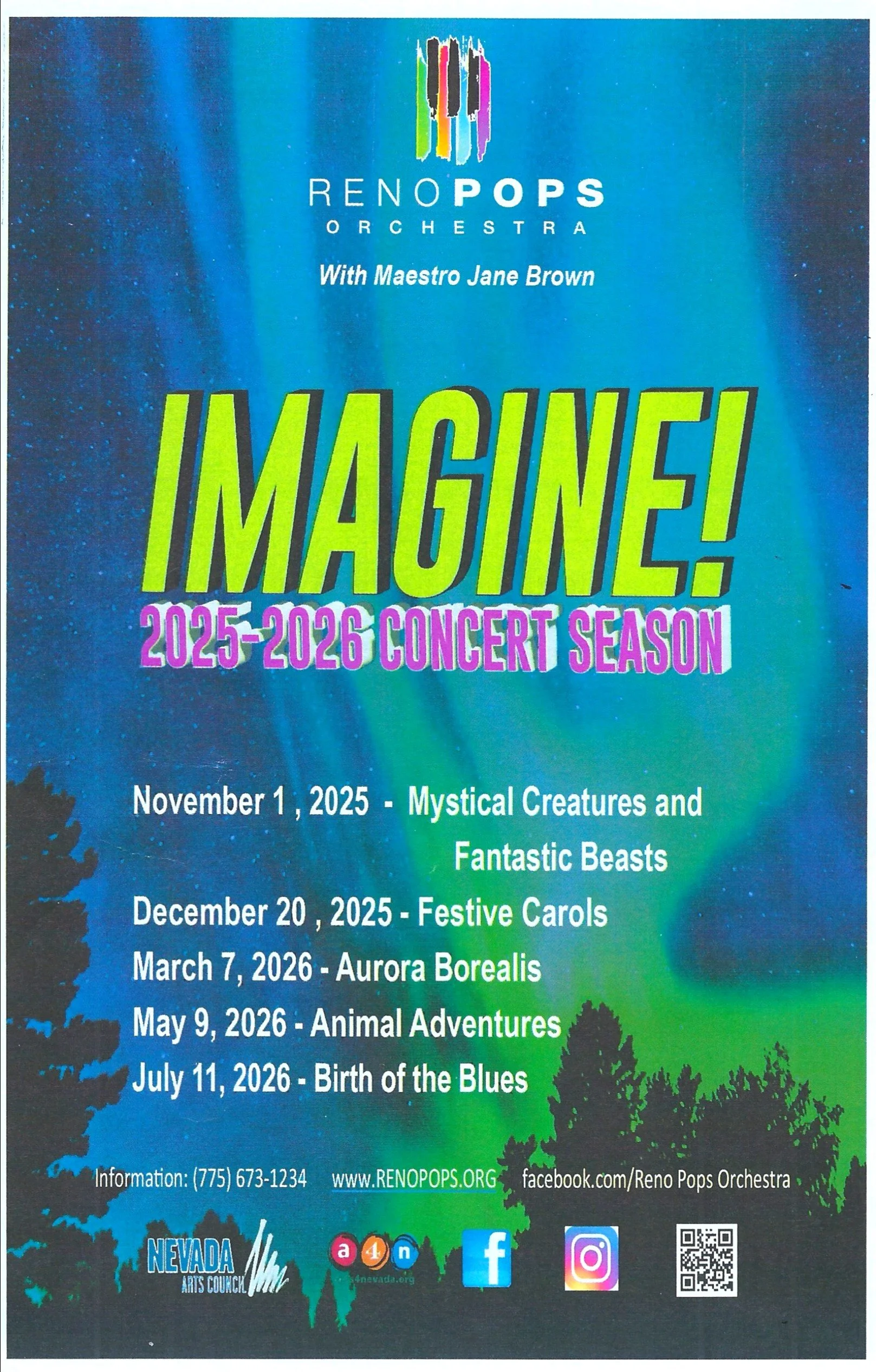 Alex notes ♪♪: The Reno Pops is truly an “orchestra for everyone.” Their lively concerts really showcase their devoted musicians and their dedication to providing quality, family-friendly music programming. This is all done under the baton of accomplished conductor, Maestro Jane Brown. Their concerts are always FREE, but the Reno Pops gladly accepts donations. Free parking is located in the Brian J. Whalen parking garage, 1664 N. Virginia Street.